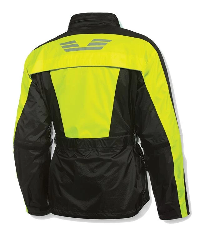 Tested in the beautiful but wet Blue Ridge Mountains, the Olympia New Horizon Rain Jacket is designed to keep you dry through even the heaviest rain storms. Constructed of lightweight, waterproof and breathable rip stop nylon, the New Horizon Jacket offers an ergonomic fit along with waist and hip adjustments to prevent wind drag as speed. The included stow-away rain hood is designed to slip on under your helmet, sealing wet weather almost completely out of your jacket.